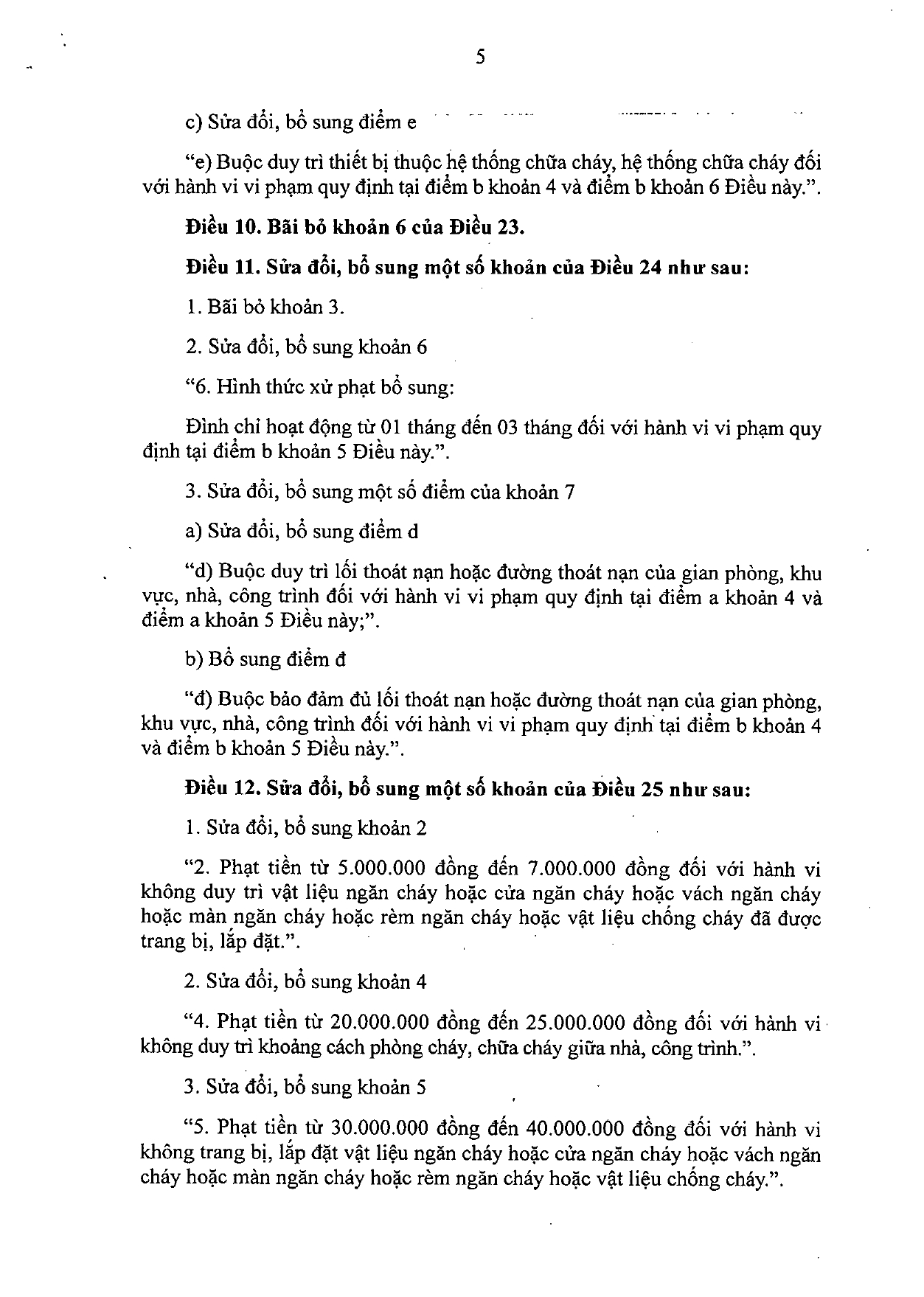 Điều 12. Sửa đổi, bổ sung một số khoản của Điều 25 như sau: Phạt tiền từ 5.000.000 đồng đến 7.000.000 đồng đối với hành vi không duy trì vật liệu ngăn cháy hoặc cửa ngăn cháy hoặc vách ngăn cháy hoặc màn ngăn cháy hoặc rèm ngăn cháy hoặc vật liệu chống cháy đã được trang bị, lắp đặt.”.